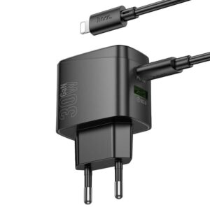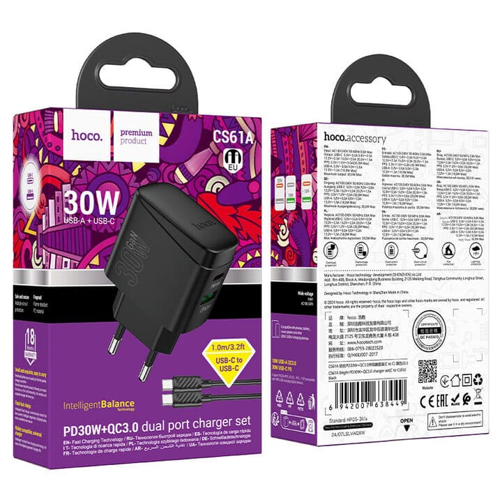 The Hoco CS61A Bright is a powerful wall charger with dual side-mounted ports (USB-C and USB-A), delivering up to 30W PD fast charging and 18W QC3.0 output. Compact and lightweight, it supports multiple fast charging protocols, making it perfect for smartphones, tablets, and other digital devices. Comes with a 1m cable set (Type-C to Lightning or Type-C to Type-C) for ultimate convenience.