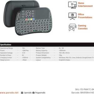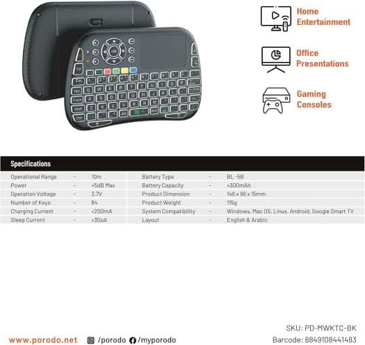 The Porodo Mini Wireless Keyboard Touch Combo is a high-performance solution designed for professionals seeking efficiency and mobility. Its sleek black design and compact build make it ideal for professionals working in dynamic environments, offering wireless freedom and a touchpad for seamless navigation. Whether used in presentations, remote work setups, or controlling smart devices, this combo enhances productivity while maintaining a minimalist footprint.