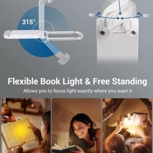 【Flexible for Reading in Bed】350° flexible holder bends to any angle for your best viewing. LED lens can be swiveled 90° counter-clockwise and clockwise, and 45°downward, illuminating both pages fully without disturbing bedmate.